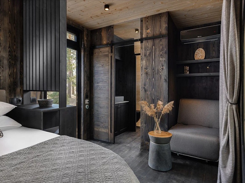 Спальня с кроватью 160×200, мини-гардеробная, санузел, кресло-кровать с зоной для чтения, кондиционер, панорамное остекление, уличная мебель.